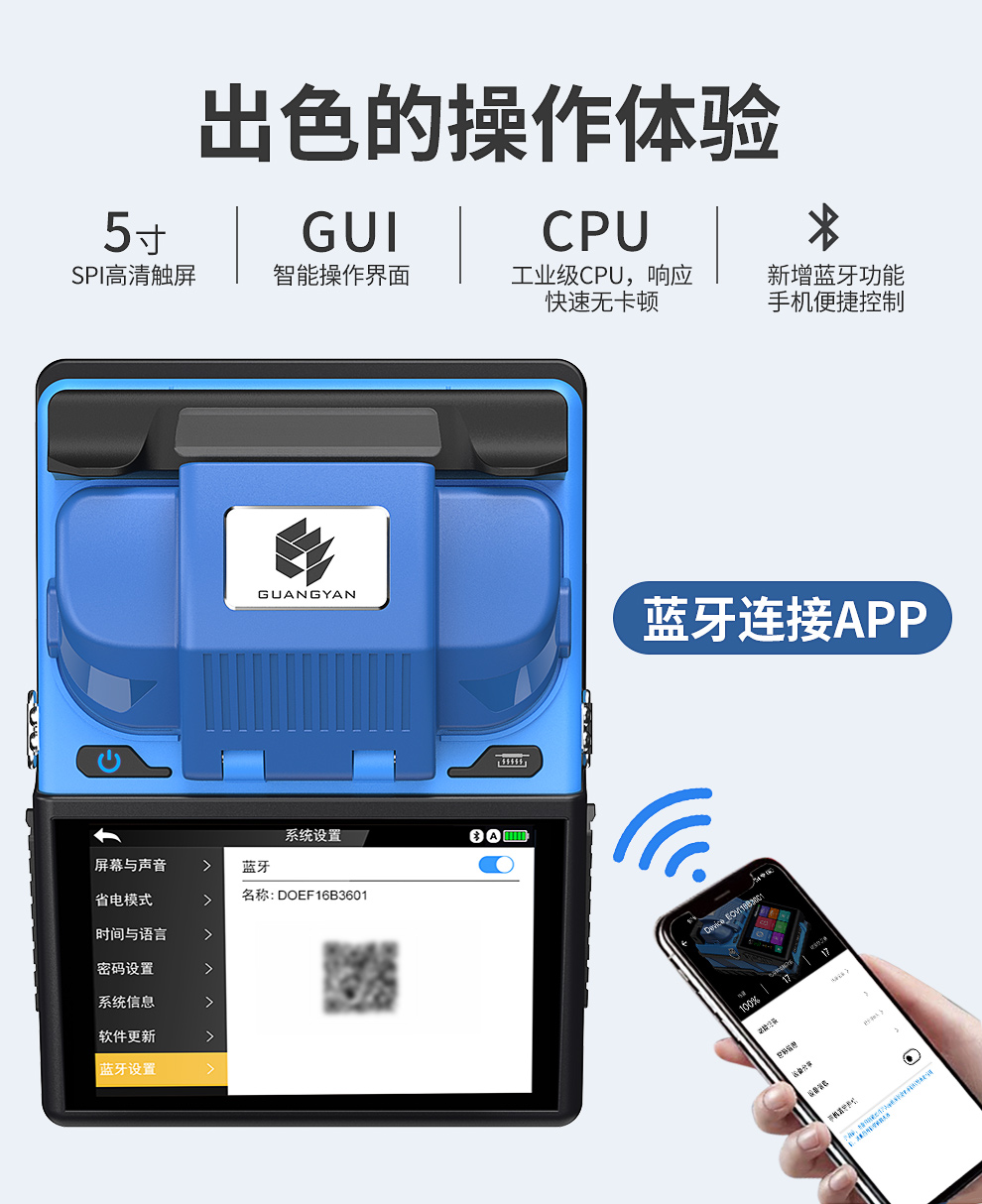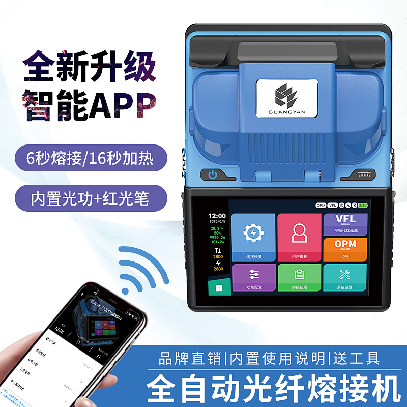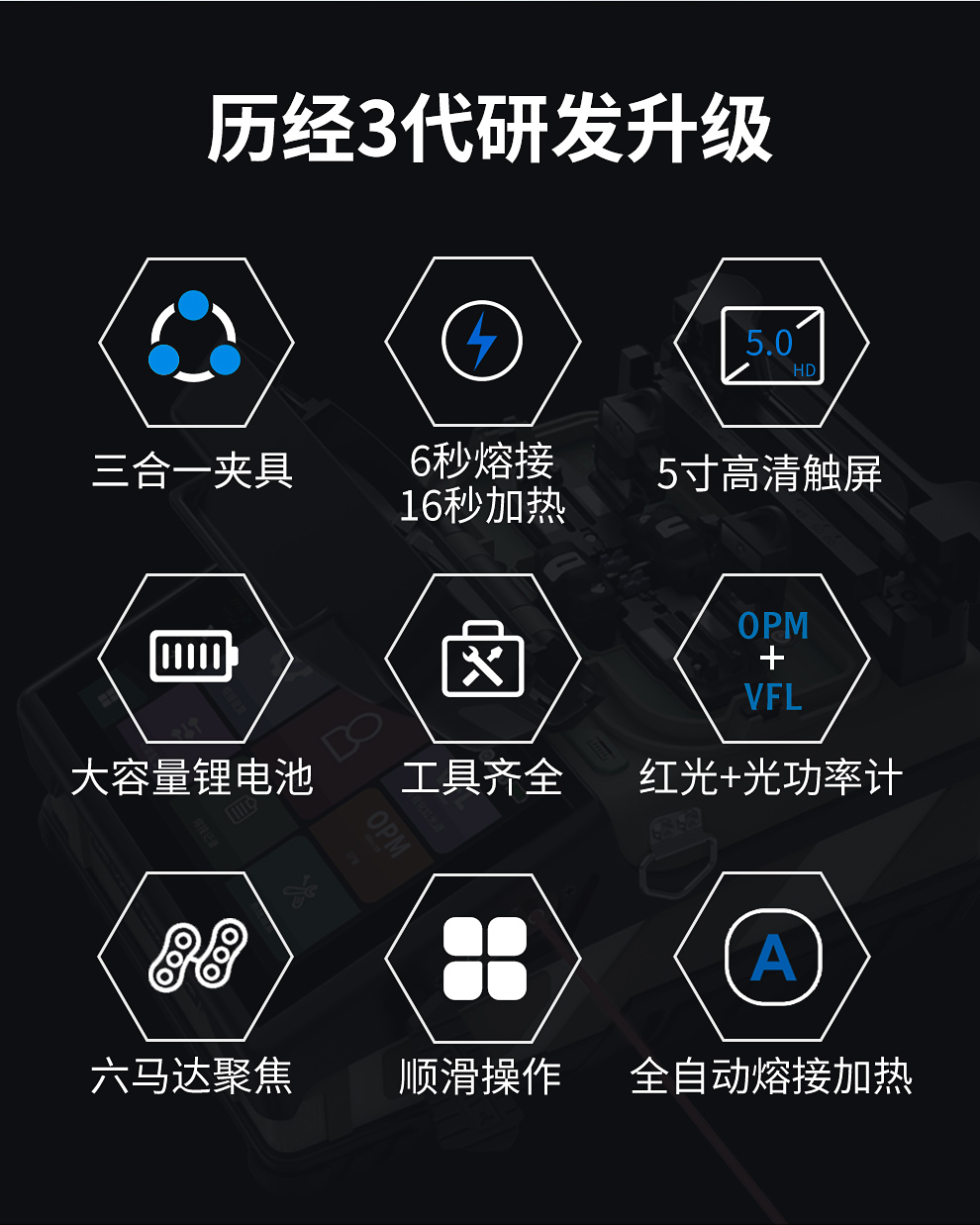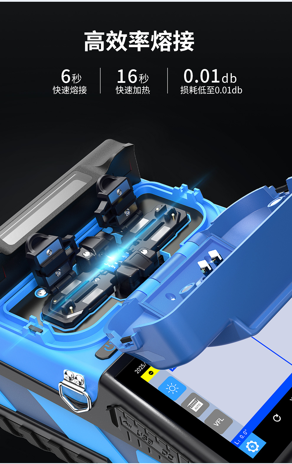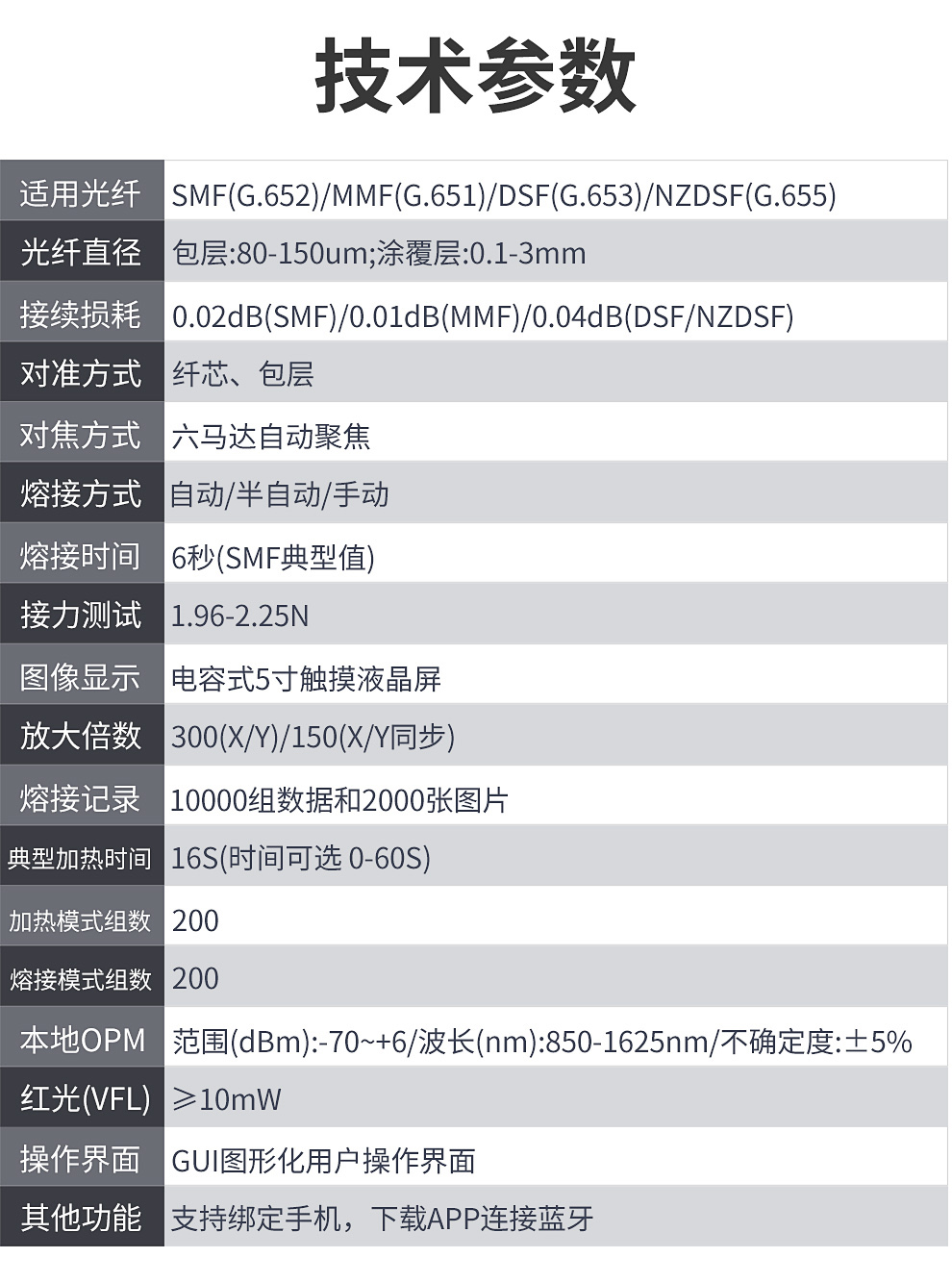 历经3代研发升级 新增蓝牙功能 可手机APP操控 6秒熔接 16秒加热 六马达自动聚焦 低损耗 顺滑操作 7800mHA大容量锂电池 5寸高清触屏 三合一夹具 内置光功率计+红光功能 全自动熔接加热