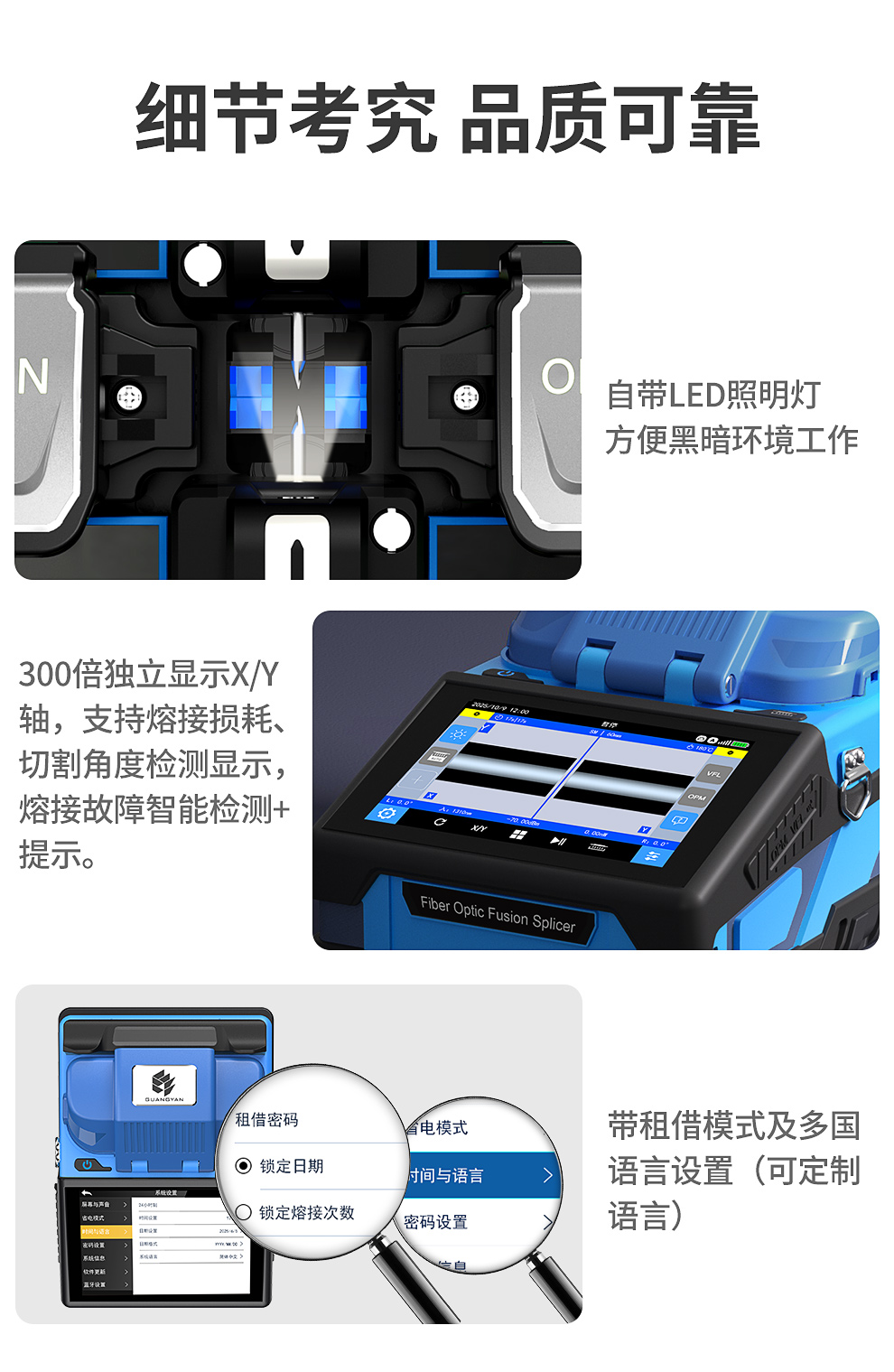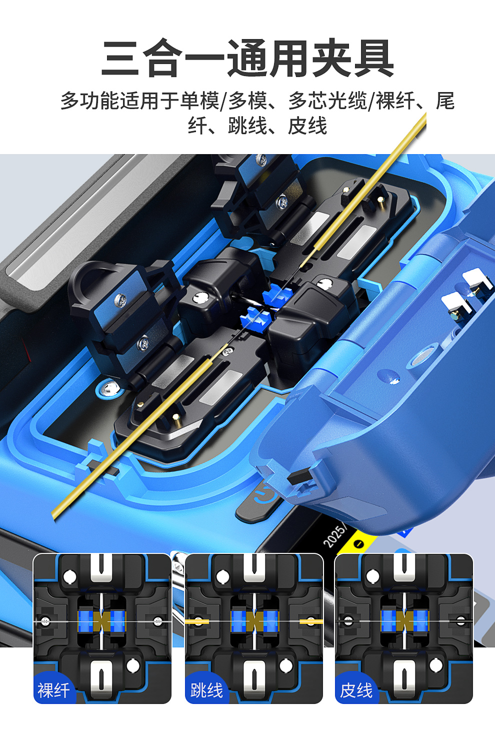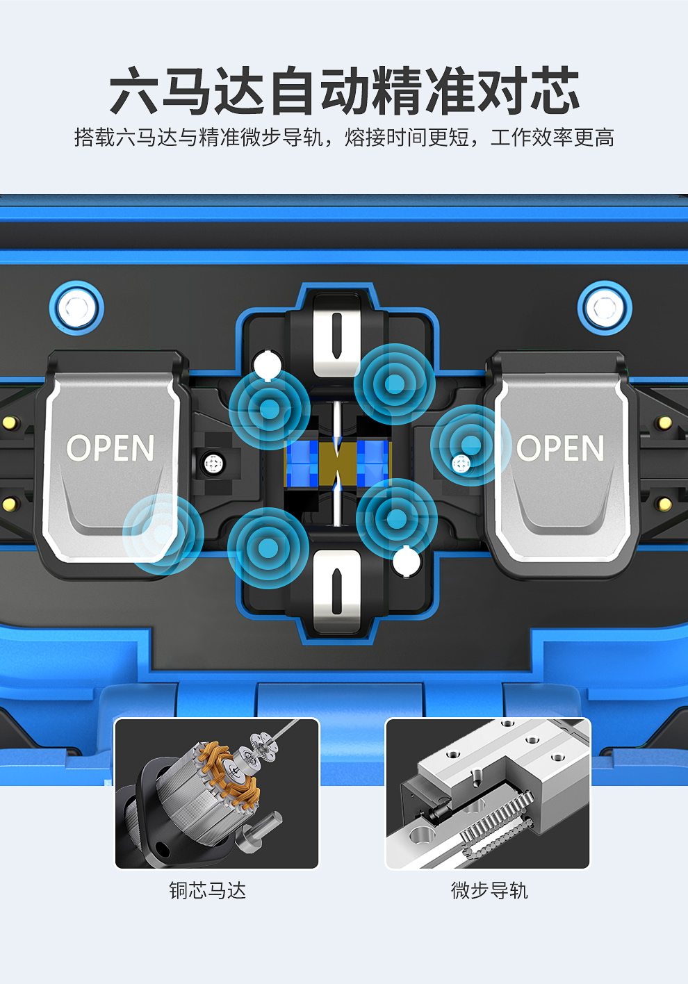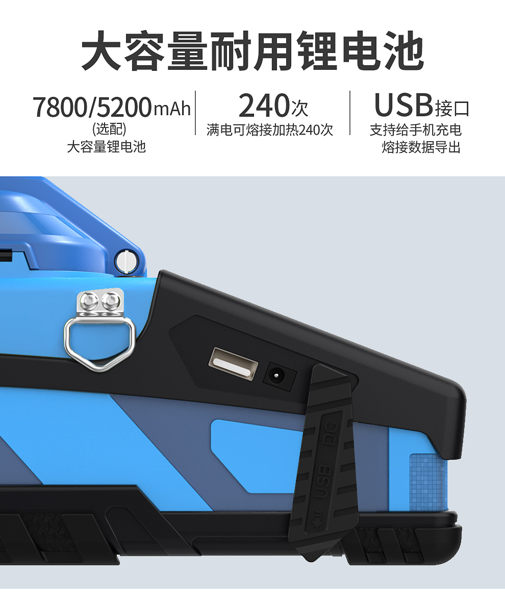历经3代研发升级 新增蓝牙功能 可手机APP操控 6秒熔接 16秒加热 六马达自动聚焦 低损耗 顺滑操作 7800mHA大容量锂电池 5寸高清触屏 三合一夹具 内置光功率计+红光功能 全自动熔接加热